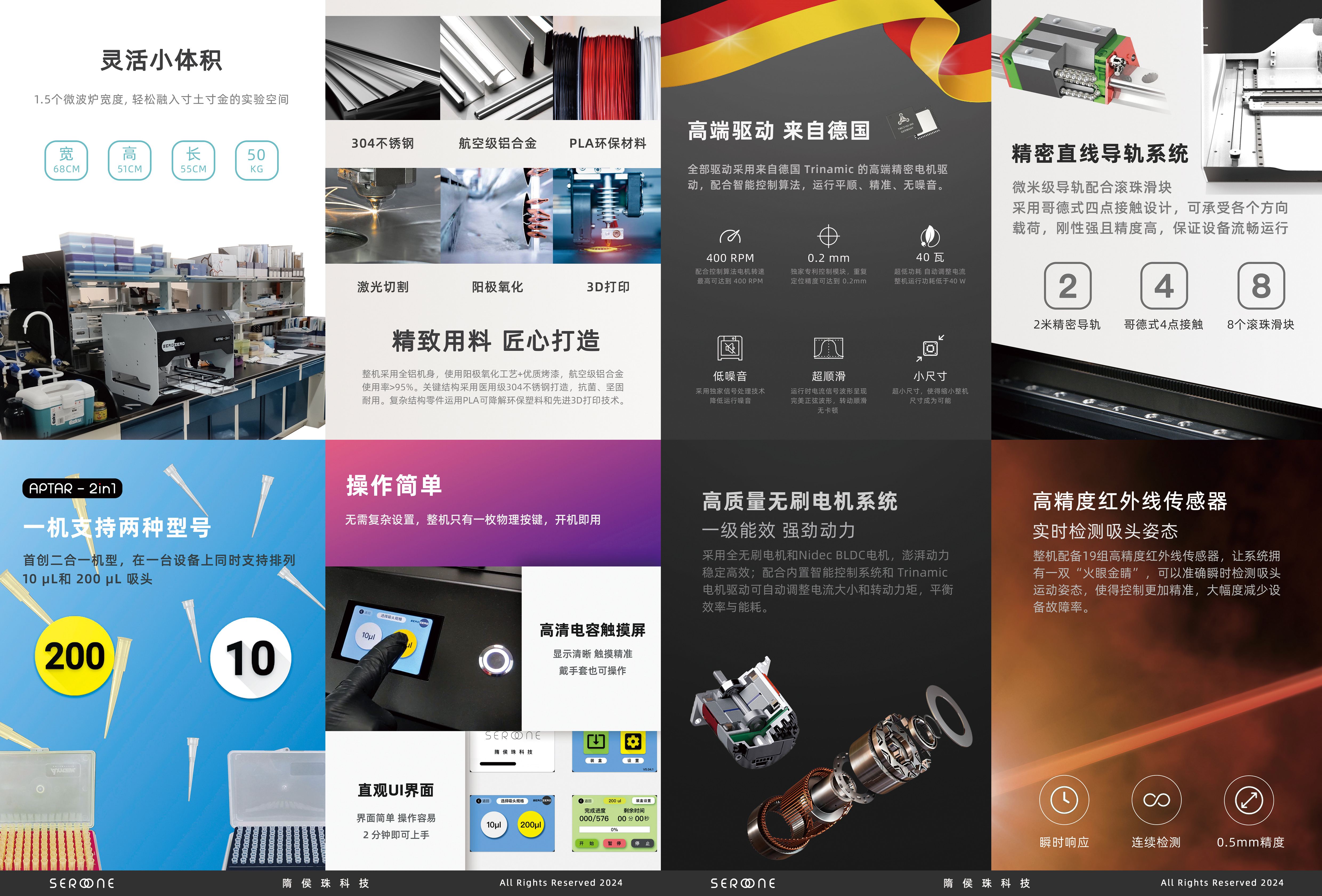 1. 二合一機型;在不更換硬件零件的情況下,一臺設備可同時支持排列兩種規(guī)格吸頭,標準機型為一機同時支持10ul和200ul吸頭;可支持匹配進口、國產(chǎn)等多種品牌吸頭,支持10ul/20ul/200ul/250ul/300ul/350ul吸頭中任意兩種規(guī)格定制。