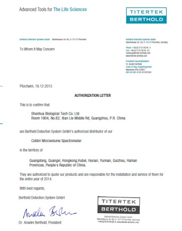 德國伯赫Titertek Berthold是一家擁有35年歷史的著名生命科學(xué)儀器制造廠商,是專注于樣品處理、自動工作站和樣品檢測的高科技公司。總部和研發(fā)生產(chǎn)基地設(shè)在美國Huntsville和德國Pforzheim。2011年德國伯赫Titertek-Berthold公司并推出一款新型超微量分光光度計-Colibri,2013年廣州市深華生物技術(shù)有限公司正式成為德國Norllu伯赫公司超微量分光光度計南方區(qū)總代理。
