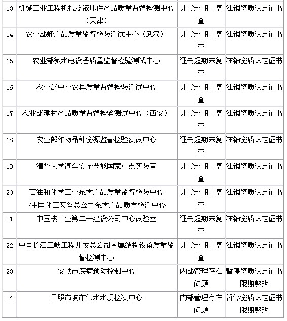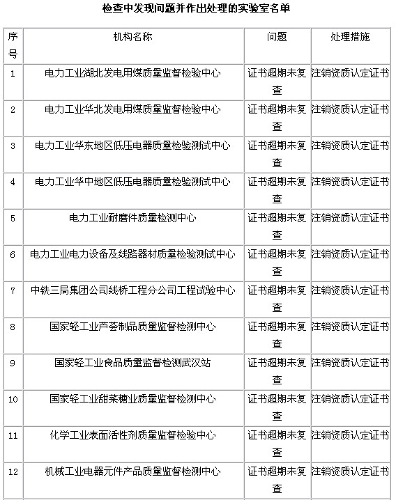 1.此次檢查發(fā)現(xiàn)了個別實驗室的質(zhì)量管理體系存在較大問題,部分實驗室證書到期未申請復(fù)查(名單見附件),將分別采取限期整改或者注銷資質(zhì)認定證書的處理措施。