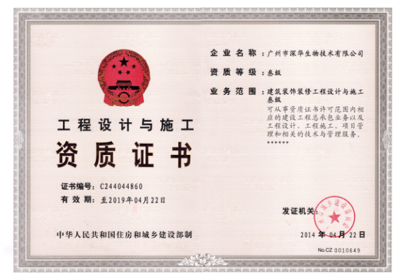 廣州市深華生物技術有限公司喜獲建筑裝飾裝修工程設計與施工資質證書叁級,讓廣州深華公司在權威機構的資質領域又新增一份實力的證明。