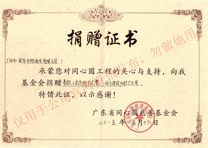 廣州市深華生物技術有限公司于2015年5月23日向廣東省同心圓慈善基金會捐贈善款人民幣十萬元整,用于建設鄉村衛生室,改善鄉村醫療環境。給予了充分的關注與支持。