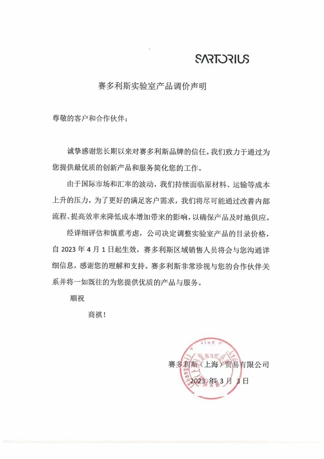 賽多利斯將于2023年4月1日起執(zhí)行新價(jià)格