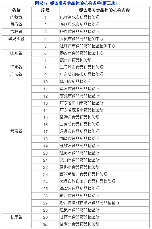 國家食藥監(jiān)局公布第三批餐飲食品檢驗機構(gòu)名單