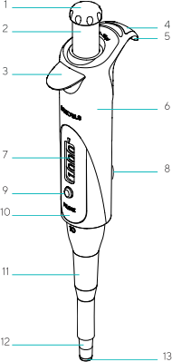 6.手柄7.顯示屏8.校準(zhǔn)螺母9.容量鎖定鈕10.顏色編碼