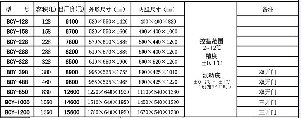 容積(L):328;外形尺寸(mm):610*650*1900;內(nèi)膽尺寸(mm):500*520*1200;控溫范圍:0-12℃;精度:±0.1℃;波動度:±0.2℃-±1℃(設(shè)定25℃時)。