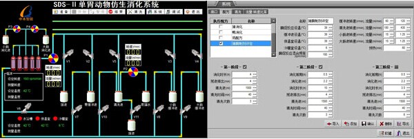 SDS-II單胃動(dòng)物仿生消化系統(tǒng)由模擬消化器和控制系統(tǒng)組成。模擬消化器中透析袋內(nèi)視為胃、小腸、大腸的內(nèi)環(huán)境(消化環(huán)境),透析袋外視為毛細(xì)血管體液環(huán)境(吸收環(huán)境)。采用組態(tài)軟件技術(shù)通過(guò)電腦程控進(jìn)入模擬消化器內(nèi)的緩沖液自動(dòng)輸入-排空-切換系統(tǒng)、消化液自動(dòng)分泌系統(tǒng)、水解產(chǎn)物自動(dòng)清洗系統(tǒng)、恒溫控制系統(tǒng)、混合強(qiáng)度自動(dòng)控制系統(tǒng)、電子元件信號(hào)檢測(cè)系統(tǒng)等模塊,實(shí)現(xiàn)對(duì)豬禽胃腸道消化過(guò)程的全自動(dòng)模擬。